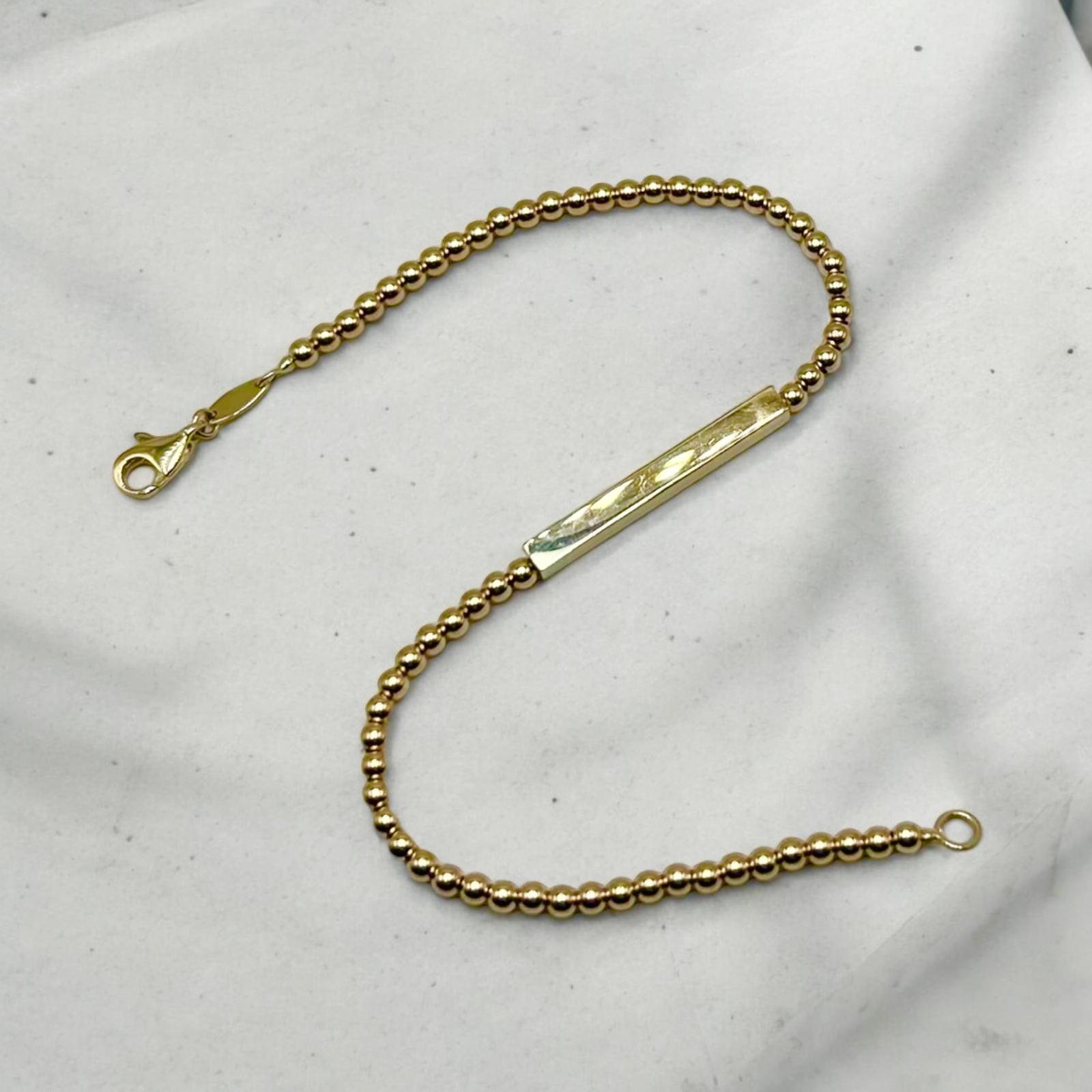 Expertly crafted with 14K gold, this beaded bracelet is a delicate yet stylish addition to any outfit. The sleek bar design adds a modern touch, while the beaded chain provides a subtle texture. Perfect for layering or wearing alone, this high-quality bracelet exudes elegance and sophistication.