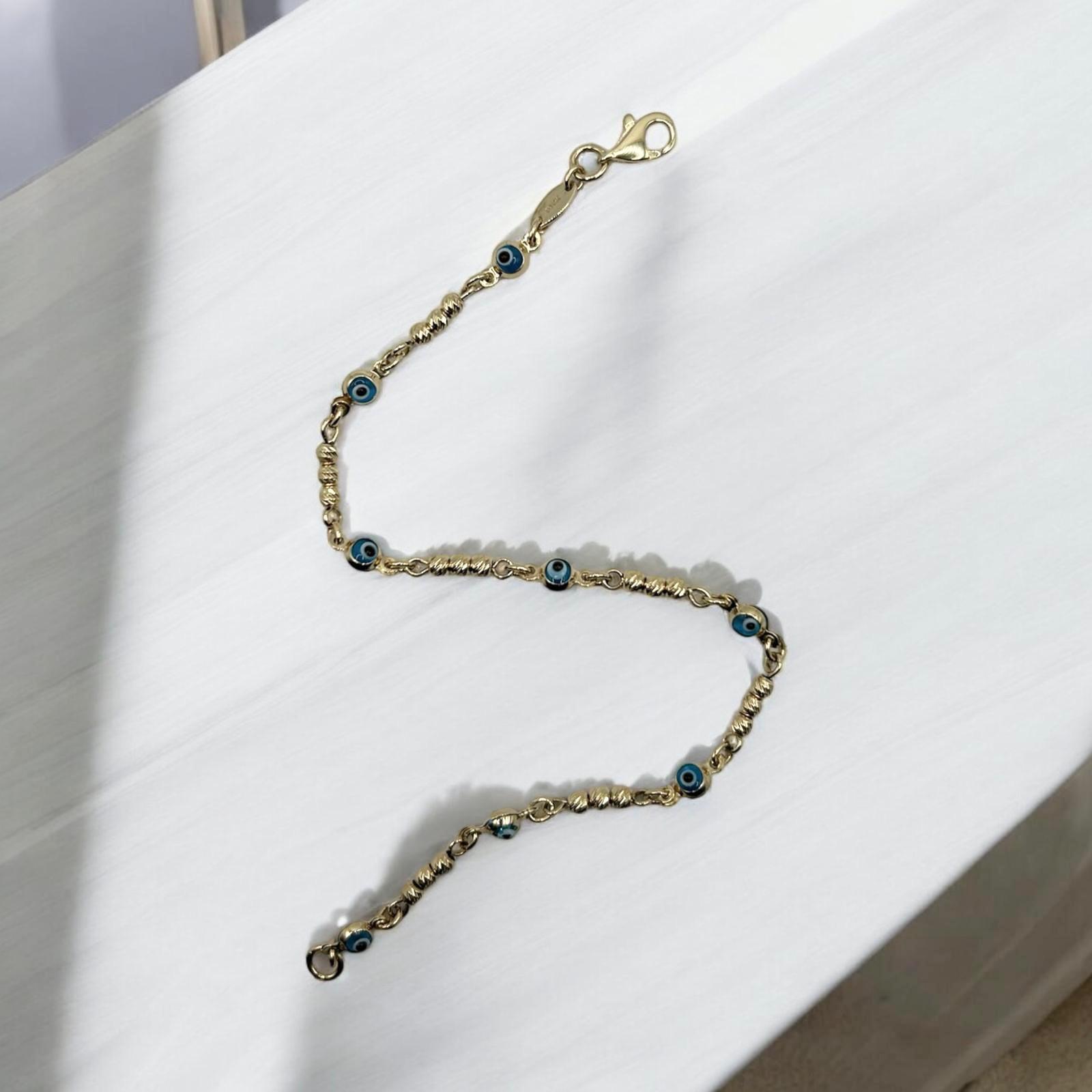 This 14K Protective Eye Beaded Bracelet provides a stylish and meaningful addition to your jewelry collection. This bracelet features a protective eye design that symbolizes protection and good luck. Wear it alone or stack it with other bracelets for a trendy look with a deeper significance.